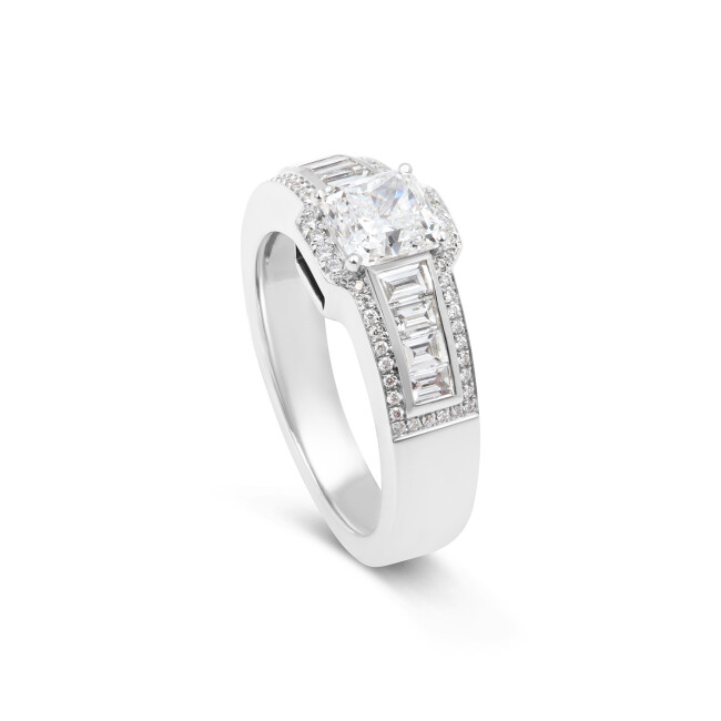 Bague Traviata en or blanc, diamant taille radiant, diamants taille baguette et diamants